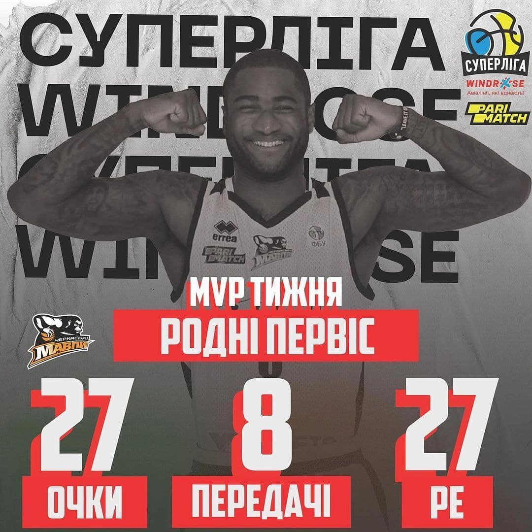 Результативний перфоманс американського захисника "Черкаських Мавп" Родні Первіса у грі з "Будівельником" відзначено Федерацією баскетболу України.