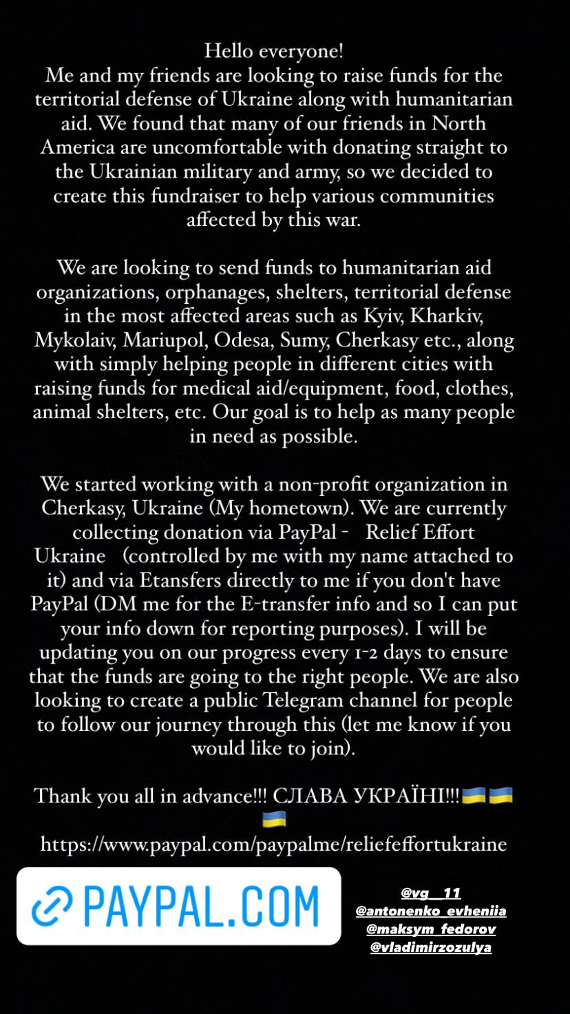 «Я і мої друзі прагнемо разом зібрати кошти на гуманітарну допомогу територіальній обороні України. Ми виявили, що багатьом нашим друзям у Північній Америці незручно робити пожертви безпосередньо українським військовим та армії, тому вирішили створити цей збір коштів, щоб допомогти різним громадам, які постраждали від цієї війни.