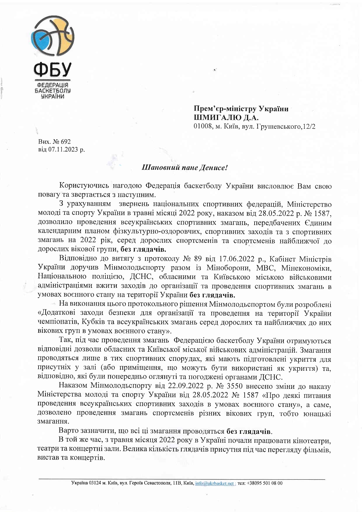 Президент Федерації баскетболу України Михайло Бродський звернувся листом до Прем'єр-міністра України Дениса Шмигаля щодо питання повернення глядачів на трибуни.