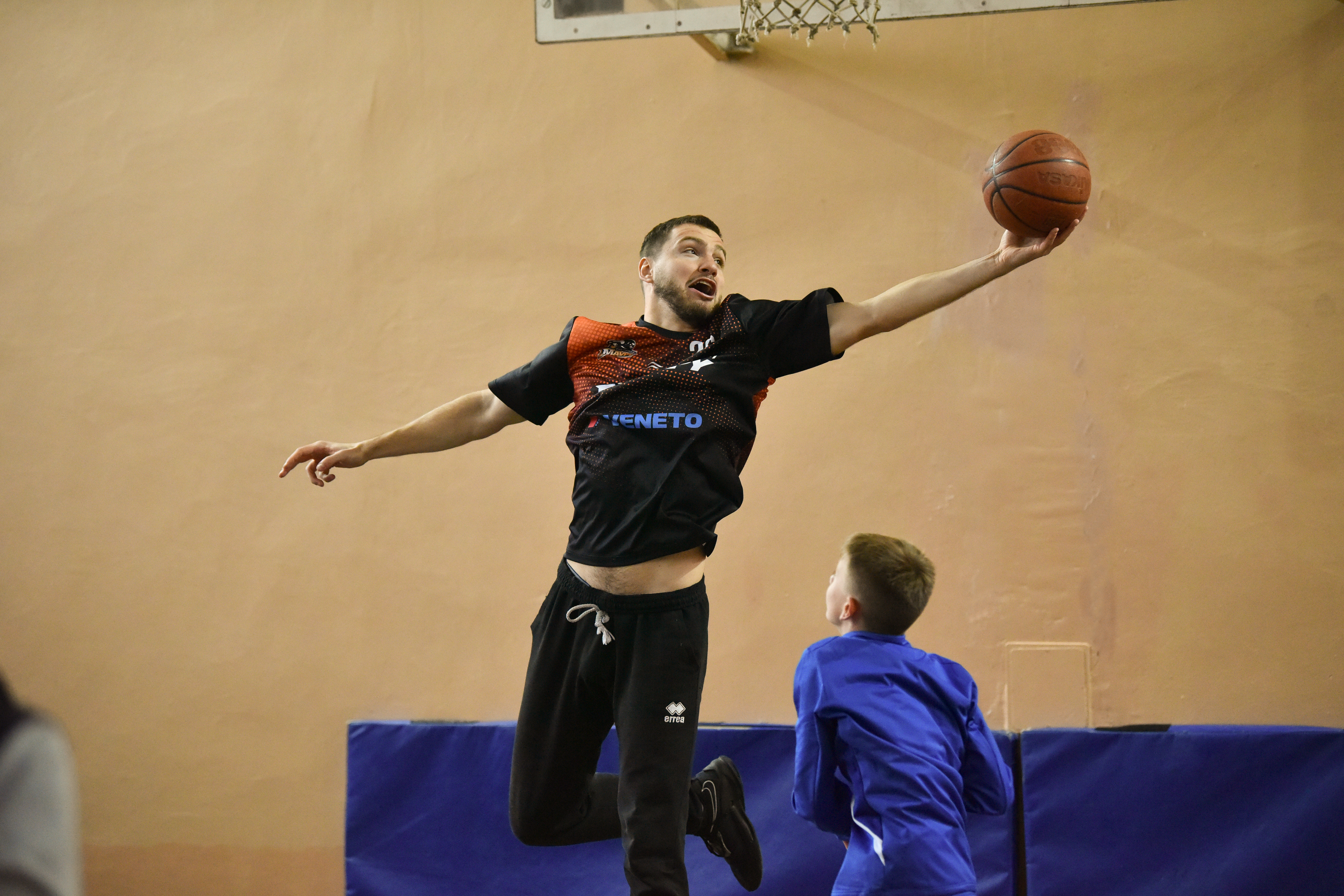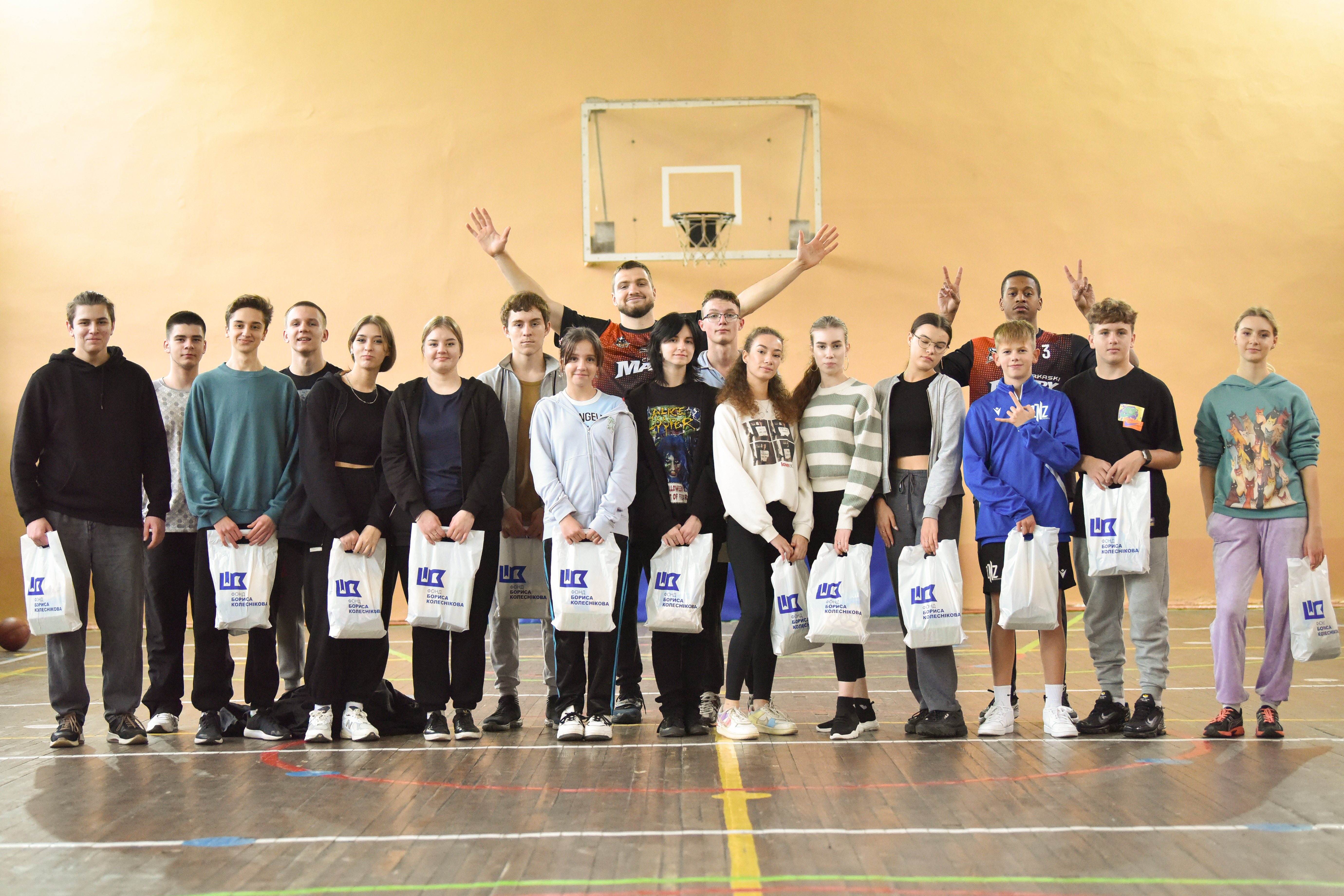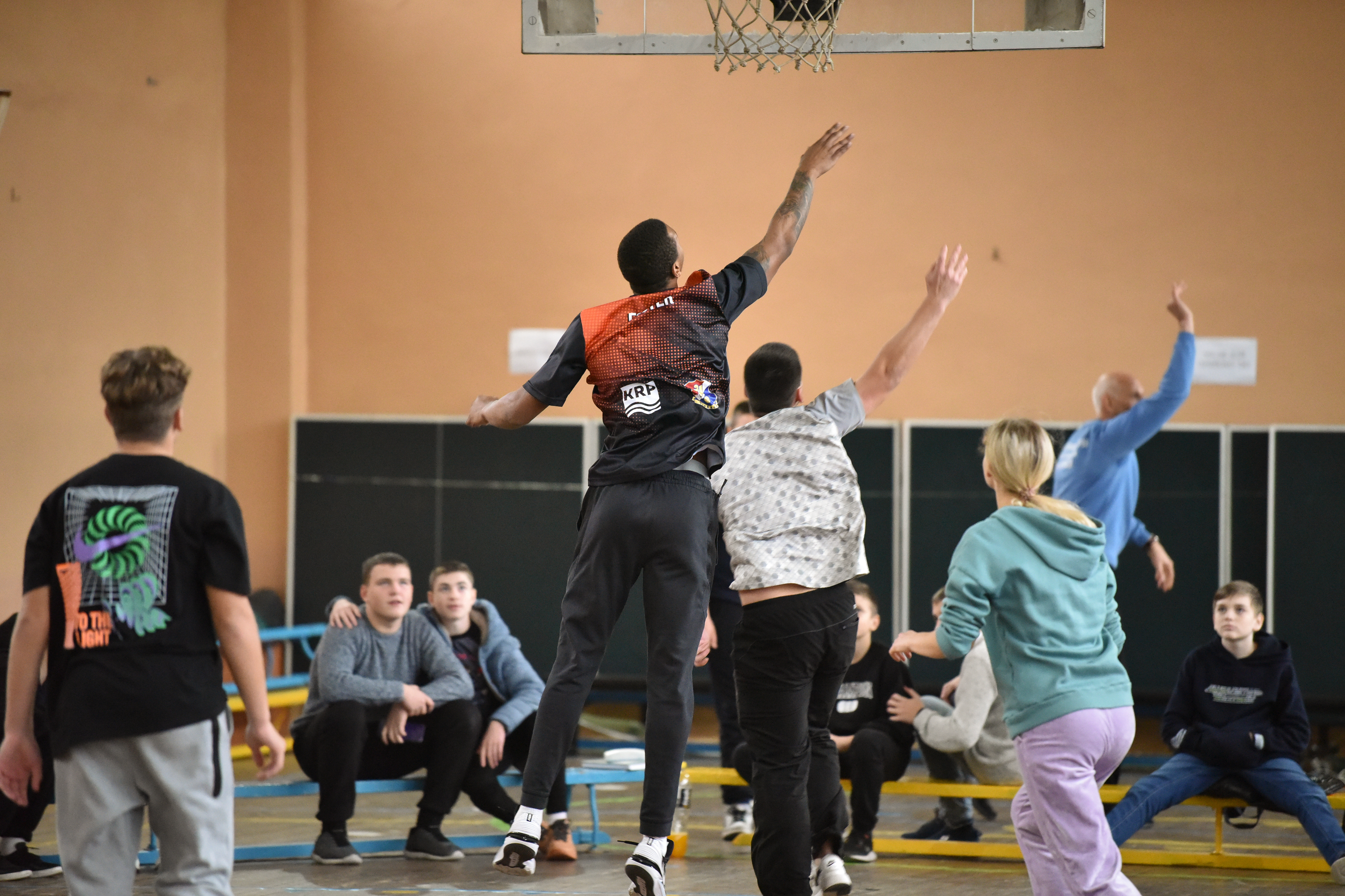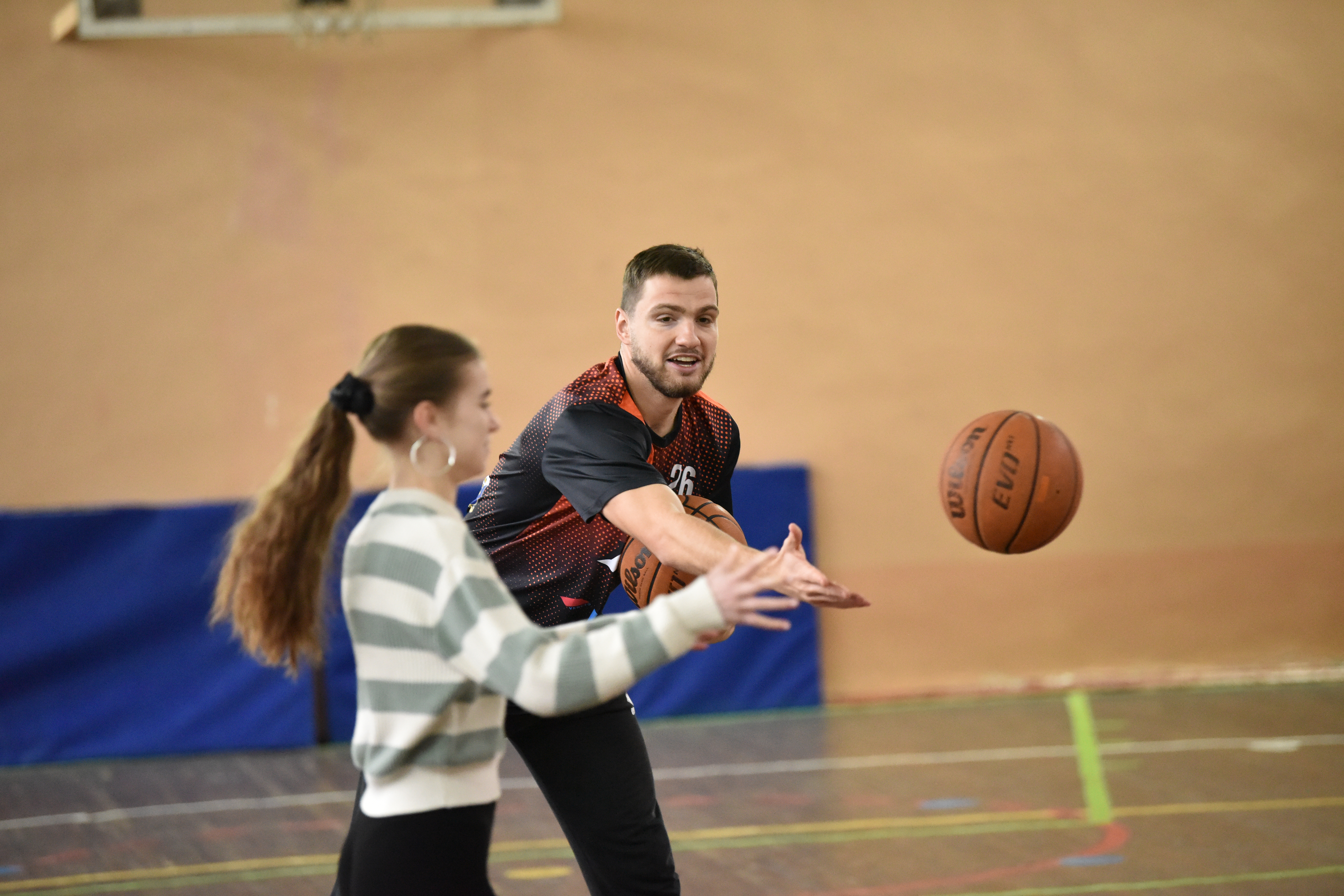 Далі на дітей чекала весела гра з представниками команди, в якій учасники відпрацьовували передачу м’яча. А на завершення учні розділились на команди та пограли в баскетбол з Нікітою та Армоні.