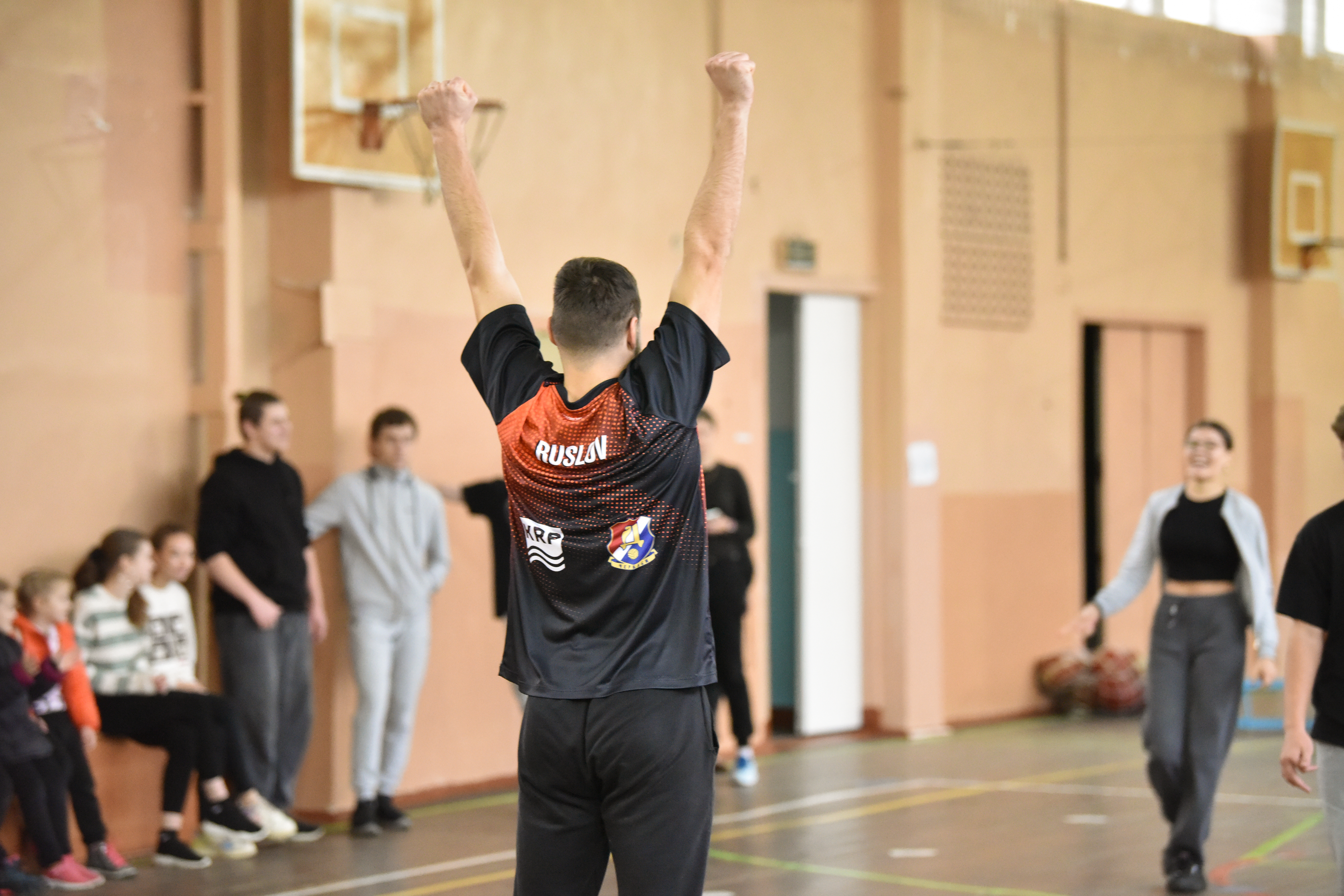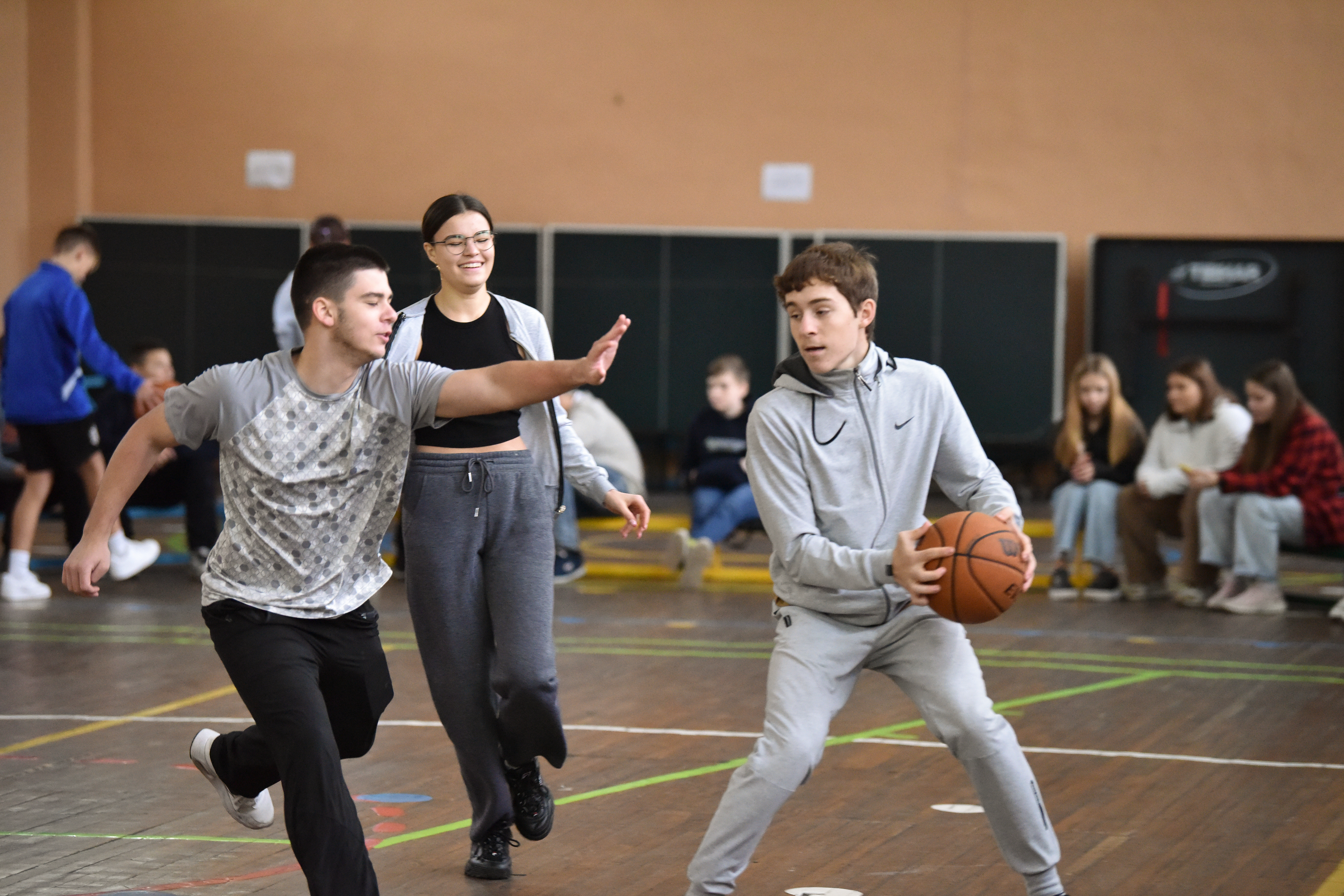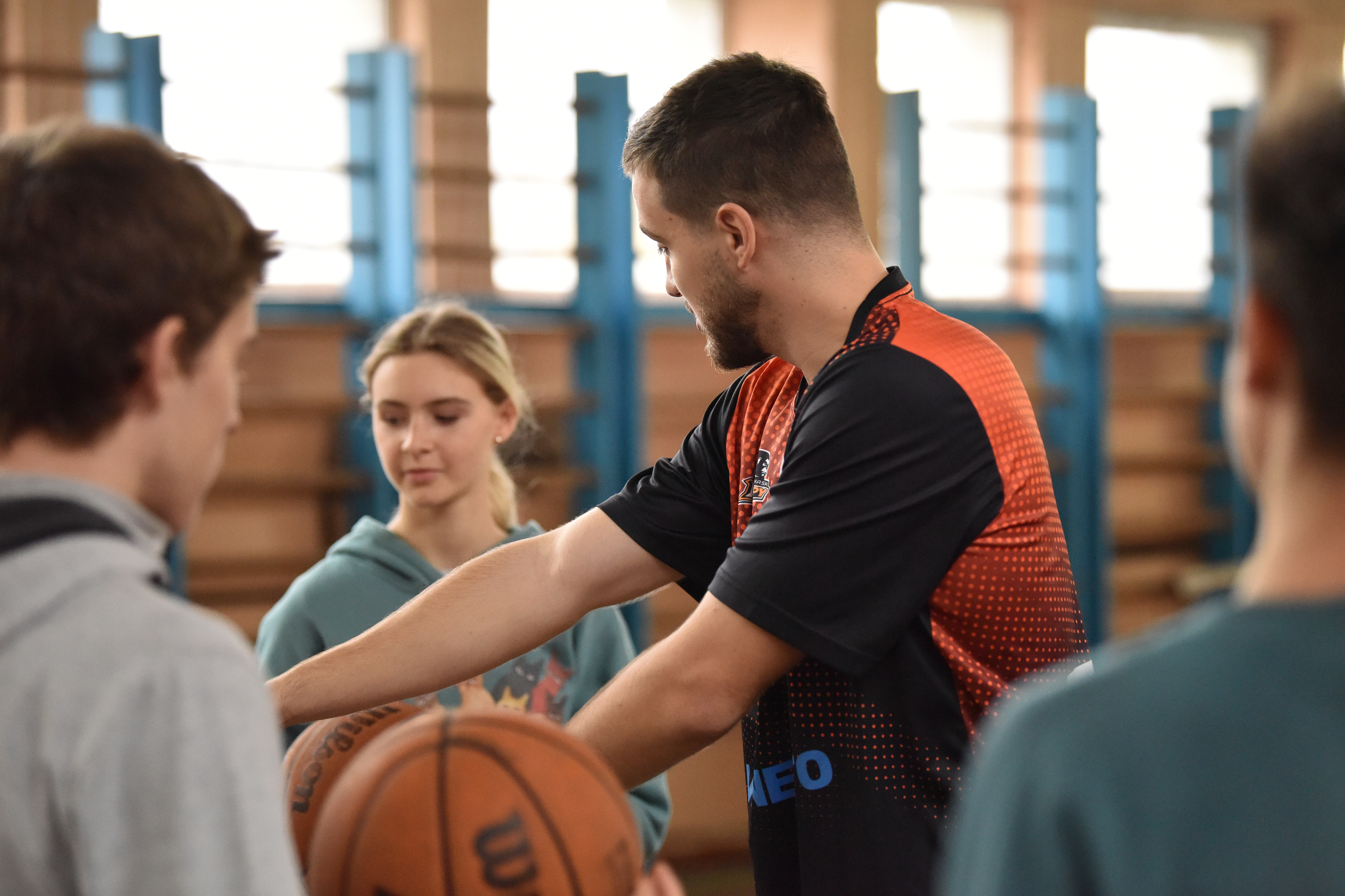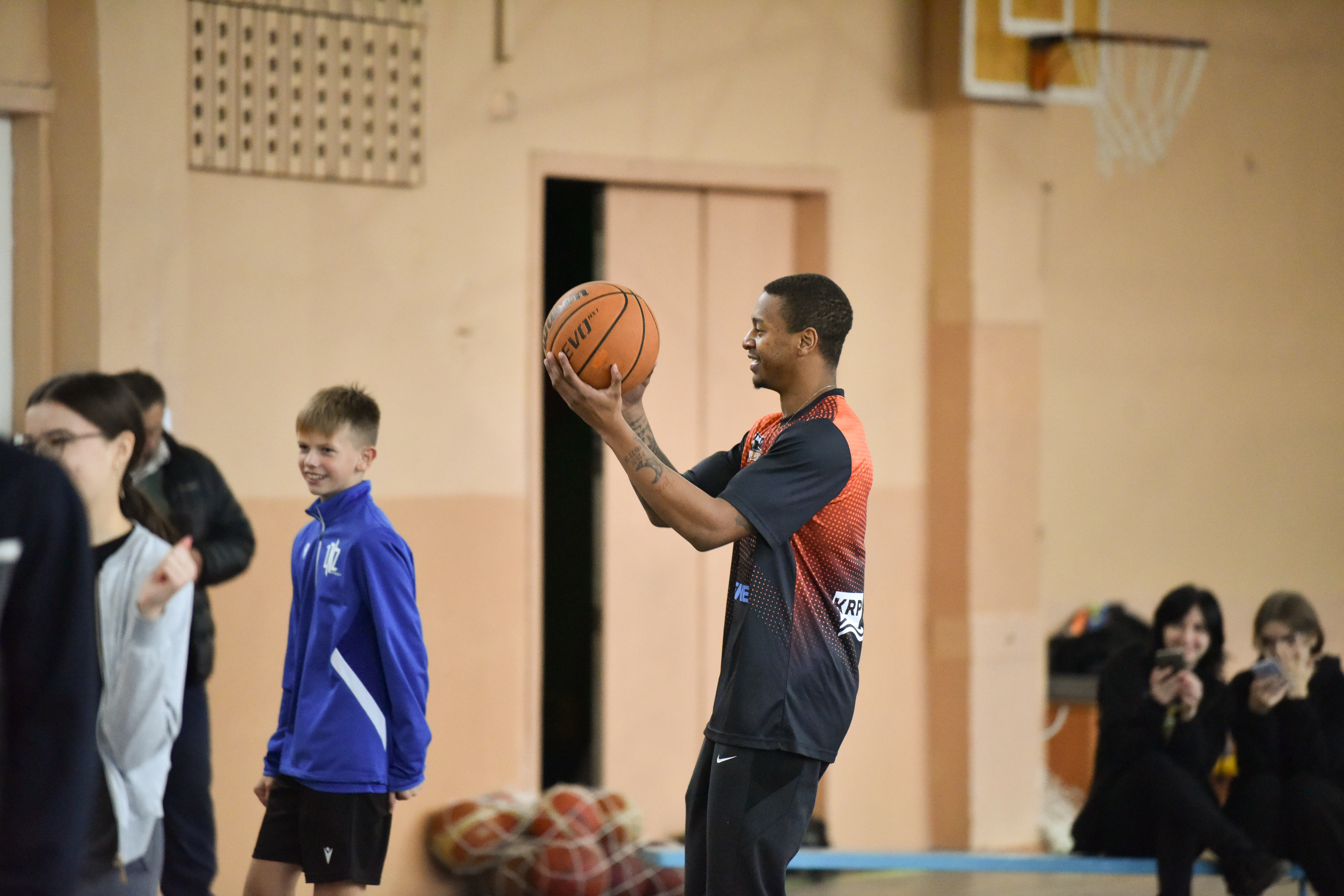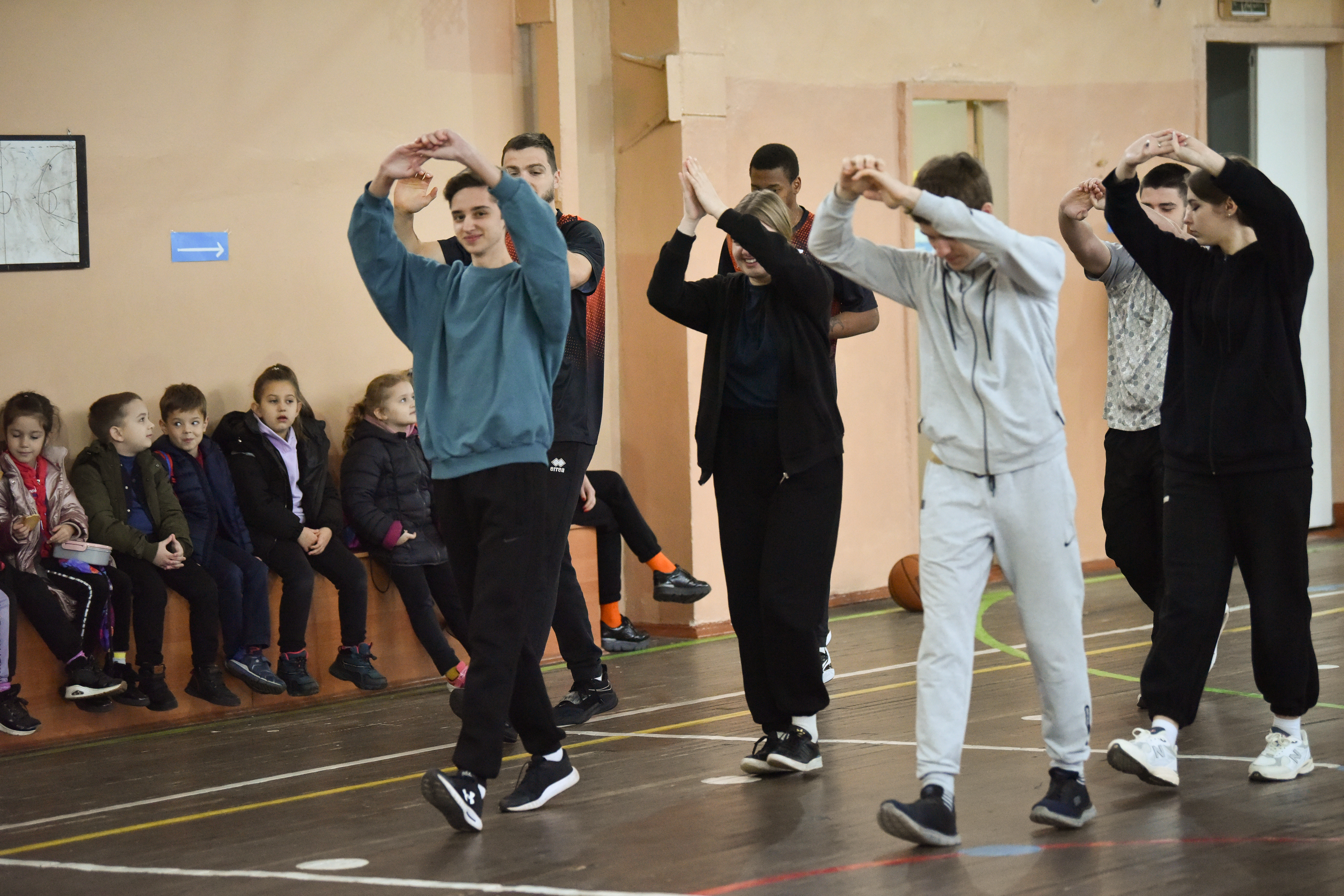 Далі на дітей чекала весела гра з представниками команди, в якій учасники відпрацьовували передачу м’яча. А на завершення учні розділились на команди та пограли в баскетбол з Нікітою та Армоні.