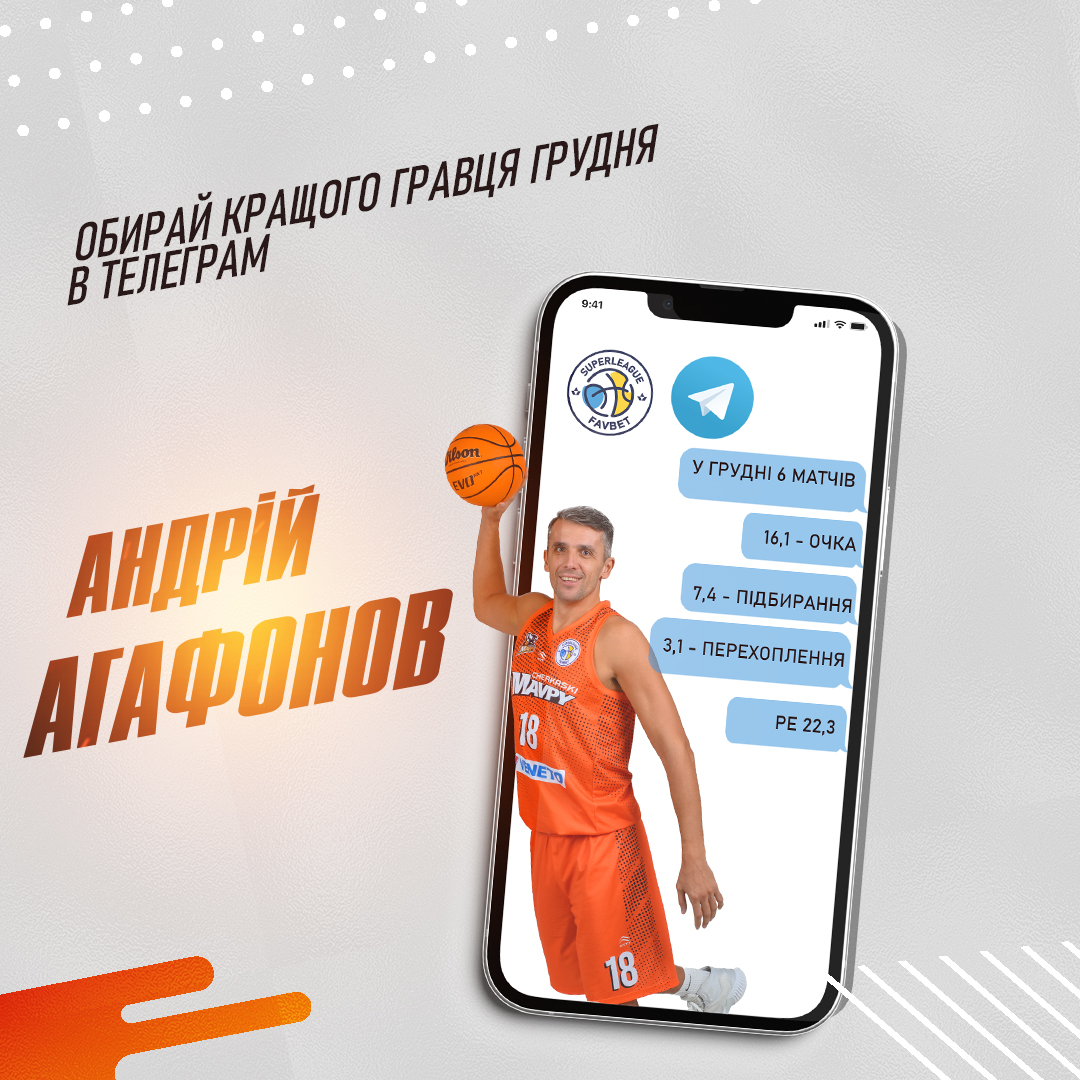 Серед претендентів на звання Гравця грудня представник «Черкаських Мавп-Дніпро» Андрій Агафонов. За 6 матчів у грудні, 3 з них переможні, Андрій набирав в середньому за гру 16.1 очка, 7.4 підбирання та робив 3.1 передачі, показник результативності - 22.3.