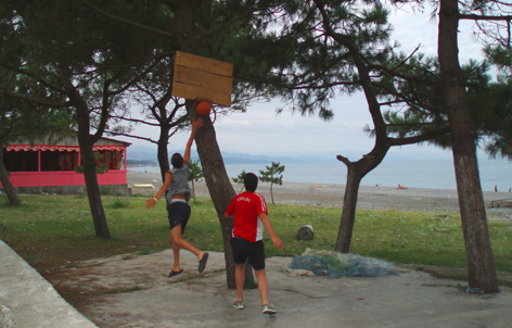 Те що ви бачите не є оптичним викривленням чи хитрим ракурсом фото. Біля просторого пляжу, де хвилі не порізані пірсами, а з іншої сторони могутні сосни, що від вітрів та вологості набули екзотичної пластики, кілька засмаглих підлітків весело грають баскетбольним м’ячем і кидають у кільце, що… (повага до баскетболу де дозволяє мені пожартувати і сказати “у кільце, що також зазнало екзотичної деформації”). Тим більш, судячи з кількості майданчиків для вуличного баскетболу, розумієш, що і сама гра тут екзотика. Але! В Грузії зовсім не дивина регбі. Також дуже дуже дуже масовим є футбол. Тут вже можна й жартувати: пів території країни відведено для гри у футбол. Поля не пустують. По них весь час хтось товчеться.