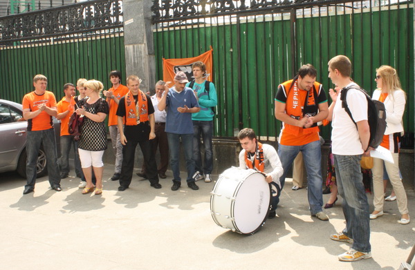 Сьогодні прихильники «Черкаських Мавп» вирушили до Києва, щоб проявити свою громадську позицію щодо участі черкаської команди в Суперлізі. Нагадаємо, попри те, що черкаський клуб в сезоні 2009-2010 виграв Вищу лігу, його участь в головному баскетбольному турнірі держави під великим питанням. Свою акцію вболівальники та адміністративний склад провели біля стін Міністерства у справах сім’ї, молоді та спорту. Головною метою мітингуючих було повернення спортивного принципу, за яким «Мавпи» мали б продовжити свою історію в Суперлізі. Подібні акції у підтримку «Черкаських Мавп» не перші, цікаво, що їх розпочали фани інших клубів. Зокрема, в такий спосіб свою підтримку під час фінальної серії «Азовмаша» та «Будівельника» висловили фани цих клубів. До того ж представники низки вболівальників команд Суперліги підписалися під листом до ФБУ та АБКУ. Свого листа сьогодні превезли до столиці і черкащани. В ньому звертаються за допомогою до Міністра сімї, молоді та спорту Равіля Сафіуліна. За відсутності самого міністра з листом ознайомився його заступник Олександр Ларін. При чому разом із юристами міністерства це питання чиновник розглядав п’ять годин, майже весь цей час черкаські вболівальники не відходили від стін міністерства, при цьому впливали на настрій його працівників своїми «кричалками». З пресою чиновник говорити відмовився, його думки чув директор ТОВ «Черкаси-Баскет» Володимир Гриценко.