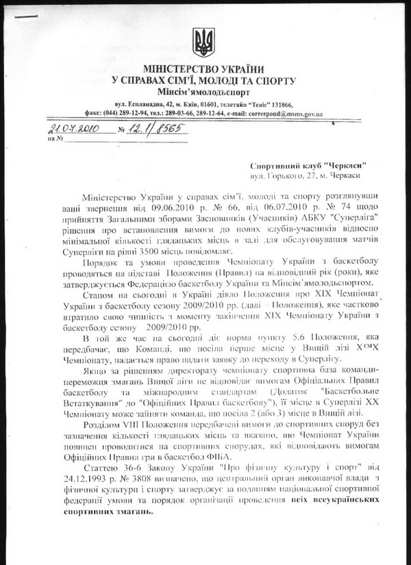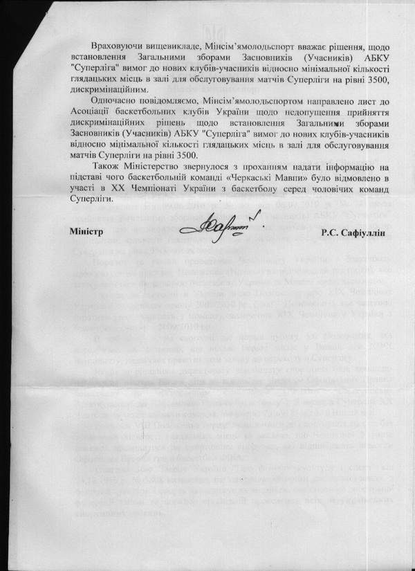 Лист Міньмолодьспорт "Черкаським Мавпам"