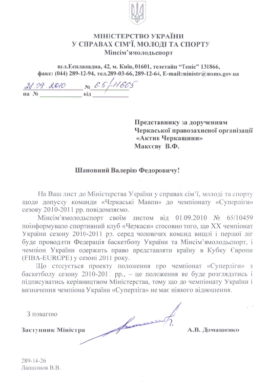 В чемпіонаті Суперліги вже відіграли кілька турів, а історія з душком навколо найпрестижнішого українського турніру та "Черкаських Мавп" набуває нових відтінків. Нагадаємо, що правозахисна організація «Актив Черкащини» подала позов до суду на українську Суперлігу «Про припинення діяльності юридичної особи та скасування її державної реєстрації". Разом з цим черкаські правозахисники відправили листа Міністру України у справах сім’ї, молоді та спорту Равілю Сафіулліну «Про позбавлення Федерації баскетболу України статусу національної». Нещодавно спеціалісту юридичного відділу «Активу Черкащини» Валерію Макеєву прийшла відповідь з Міністерства, підписана заступником міністра Домашенком. Пропонуємо вашій увазі копію листа, в якій чиновники зазначають, що повноправним чемпіоном України є переможець Вищої ліги, який і має представляти нашу державу в Єврокубках.