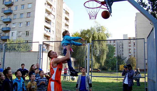 На презентацію та урочисте відкриття нового баскетбольного майданчика завітав гравець «Черкаських Мавп» – Олександр Кобець. Молодий і перспективний баскетболіст потішив публіку невеличкою шоу-програмою. Олександр продемонстрував свій високий стрибок, зробивши низку слем-данків. Після чого всі охочі діти мали можливість покидати у нове кільце разом з Олександром Кобцем. Юні любителі баскетболу щільно обступили гравця «Мавп», намагаючись продемонструвати гостю свої найкращі вміння. Гра спільно з професійним баскетболістом привернула увагу як підлітків, так і зовсім юних хлопців та дівчат. До того ж Олександр заохочував виконувати кидки. За кожний влучний кидок діти отримували по яблуку.