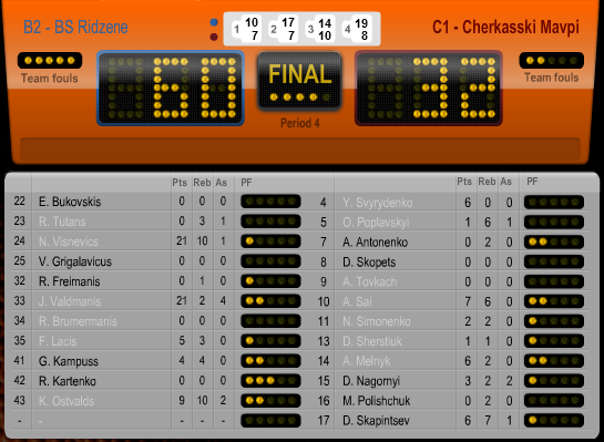 Однак у третій чверті литовці пішли у великий відрив, з яким черкаська команда не змогла нічого зробити. У підсумку «Мавпи-99» поступилися з рахунком 31 : 53. Найрезультативнішими у складі черкаської команди стали Дмитро Скапінцев (8 очок, 3 підбирання) та Нікіта Симоненко (8 очок, 4 підбирання).
