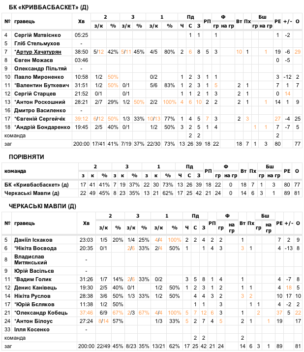 Найрезультативнішим гравцем у складі "Черкаських Мавп" став Олександр Кобець. Форварду "Мавп" не вистачило чотирьох передач до тріпл-даблу (22 очка, 12 підбирань, 6 передач). 17 очок команді приніс Антон Білоус.