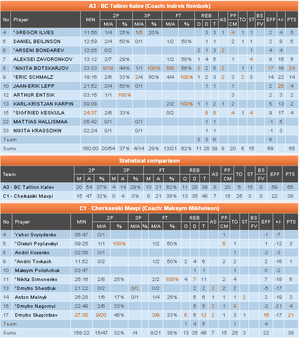 Другий день ЄЮБЛ пройшов не вдало для "Мавп-99". У першому матчі підопічні Максима Міхельсона зустрічалися з господарями туру командою ВС "Tallinn Kalev". Естонський колектив виявився сильнішим за черкасців й здобув перемогу з рахунком 65 : 38.