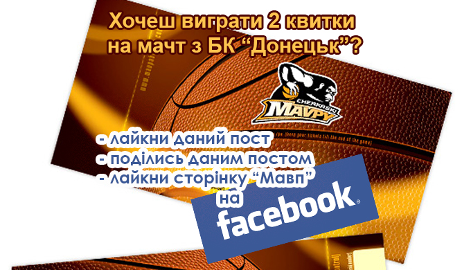 Також перед кожним домашнім матчем на сторінці https://www.facebook.com/MavpaBasket буде з'являтися новина про розіграш двох квитків серед усіх хто "лайкнуть" і поділяться даною новиною. Підписуйтесь і слідкуйте за всіма розіграшами на сторінці https://www.facebook.com/MavpaBasket.