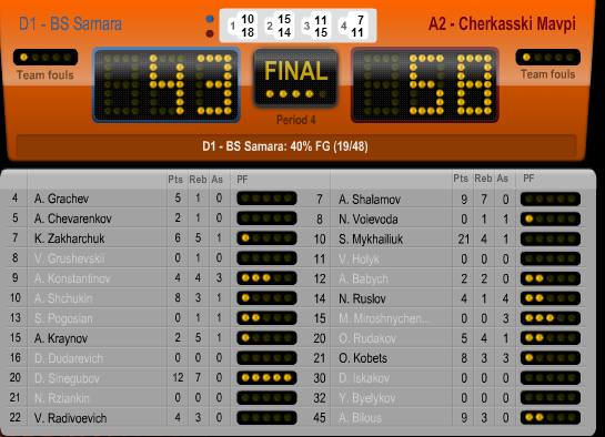 Як і в першому матчі ігрового дня, черкаські баскетболісти віддали своєму опоненту лише одну чверть. Мінімально поступившись у третьому періоді, черкасці протягом всього матчу контролювали хід гри. Найбільше для командного успіху постарався Святослав Михайлюк. В активі нашого форварда 21 очко та 4 підбирання. Завдяки цьому показнику Святослав вийшов на третю позицію за результативністю у Євролізі U-20. У активі Андрія Шаламова та Антона Білоуса у цій грі по 9 очок.