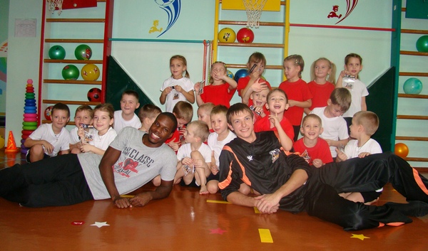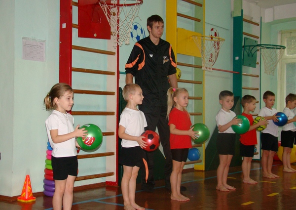 Майстер-клас проходив у сприятливій для дошкільнят формі – під акомпанемент веселої музики. Андрій Куліш та Рональд Мур разом з вихователькою провели дітям тривалу розминку. Гравці не цуралися босоніж бігати та стрибати разом з дітьми по маленькій залі.