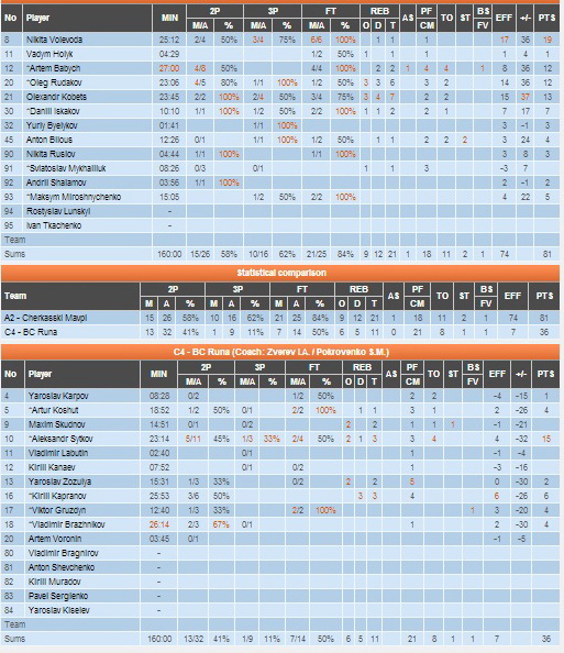 Вже на старті матчу стало зрозуміло, що проблем з "Руною" у підопічних Максима Міхельсона не буде. Гравці "Мавп-2" швидко почали доводити свою перевагу над суперником. Тому на велику перерву команди пішли за рахунку 41 : 14 на користь черкасців. Майже 30-очкова перевага не розхолодила наших баскетболістів. Гравці "Мавп" в кожній наступній чверті лише збільшували свій гандикап. У підсумку, черкаська команда здобуває впевнену перемогу з рахунком 81 : 36.
