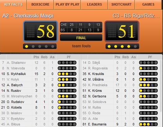 Матч між цими командами видався напрочуд складним. Гравці «Черкаських Мавп-2» вдало розпочали матч, впевнено вигравши першу чверть – 25 : 8. Проте далі латвійські баскетболісти зібралися з силами та зуміли неабияк скоротити відставання. На велику перерву команди пішли за рахунку 36 : 29 на користь «Мавп-2».