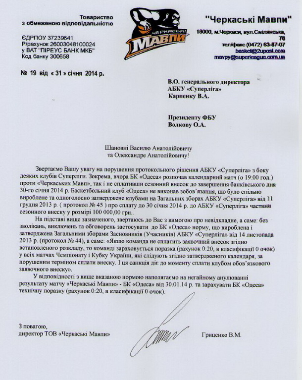 Причина: БК «Одеса» порушила протокольні рішення АБКУ «Суперліга», за які представники «Одеси» голосували і самі, та до 30-го січня не сплатили сезонного внеску. Цього ж дня (о19.00) розпочався матч «Черкаських Мавп» та «Одеси». Наш клуб наполягає на тому, щоб БК «Одесі» була зарахована технічна поразка – 0:20, відповідно до протоколу №44.