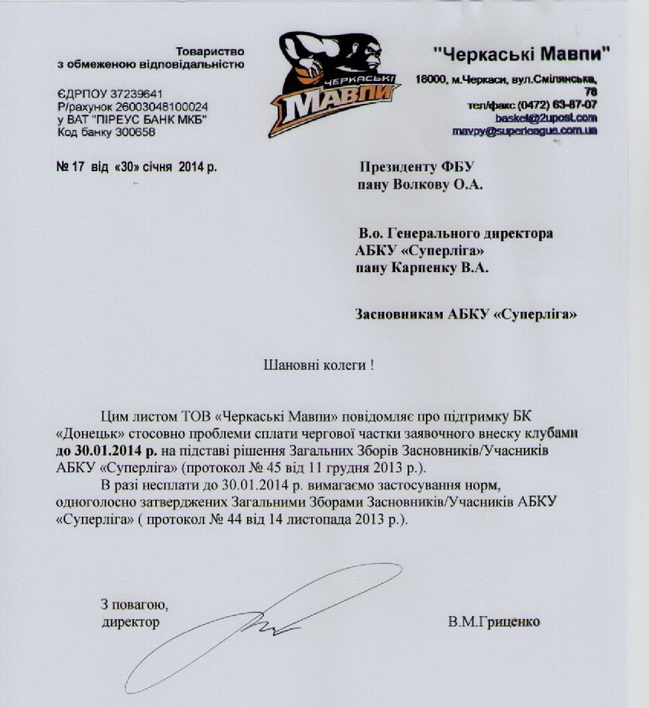 Причому «Черкаські Мавпи» виступали за покарання клубів, які не сплатили внесок, відповідно до регламенторних документів ще до гри з «Одесою». Напередодні БК «Донецьк» оприлюднив власну позицію на предмет цього та застосування передбачених санкцій. Наш клуб підтримав «Донецьк», про що йшлося в листі 30 січня до президента ФБУ Олександра Волкова та в.о. генерального директора Суперліги – Василя Карпенко.
