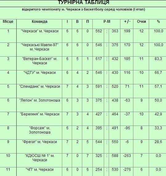Окрім того сьомий тур чемпіонату Черкас запам’ятався результативним поєдинком «Ветеран-Баскета» та «ЧДТУ», у якому гору взяли «ветерани» - 102:87. У турнірній таблиці все без змін. Лідерство продовжують утримувати "Черкаси" та "Черкаські Мавпи-97". "Ветеран-Баскет" йде слідом, маючи на одне очко менше. У наступному турі, який відбудеться 16-того лютого, у ПС «Будівельник» зійдуться лідери. О 16.00 «Ветеран Баскет» зіграє з «Черкаськими Мавпами-97».