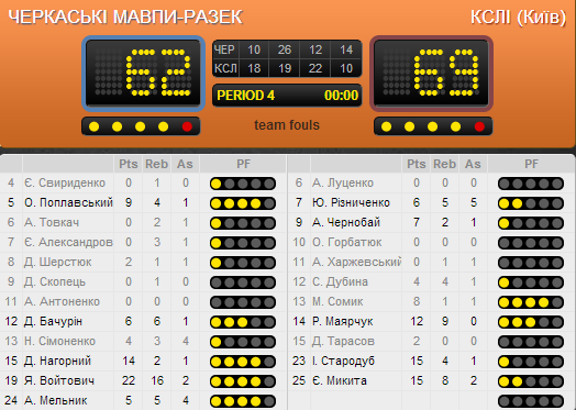 Перша половина пройшла за рівної боротьби, команди то відпускали, то наздоганяли одна одну, як результат на велику перерву суперники пішли за рахунку 37:36 на користь «КСЛІ». Черкасців традиційно вів за собою Войтович, який у цьому матчі оформив дабл-дабл: 22 очки та 16 підбирань і забезпечив черкасцям домінування у трисекундній зоні.