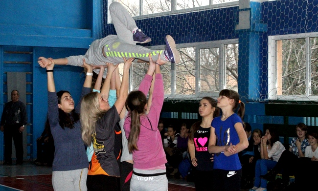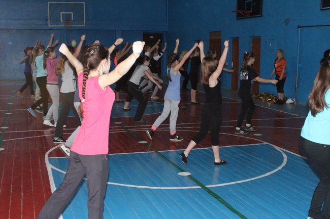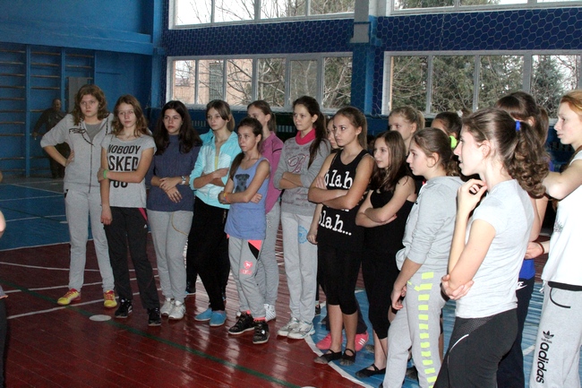 Урок фізкультури перетворився на справжній хореографічний лікбез.. Спочатку хореограф групи підтримки «Мавп» - Ірина Євченко розповіла історію черлідингу, а також головні компоненти цього поєднання танців, акробатики та гімнастики. Участь у зустрічі брали виключно дев’ятикласниці, а от глядачів заходу представляли різні класи.