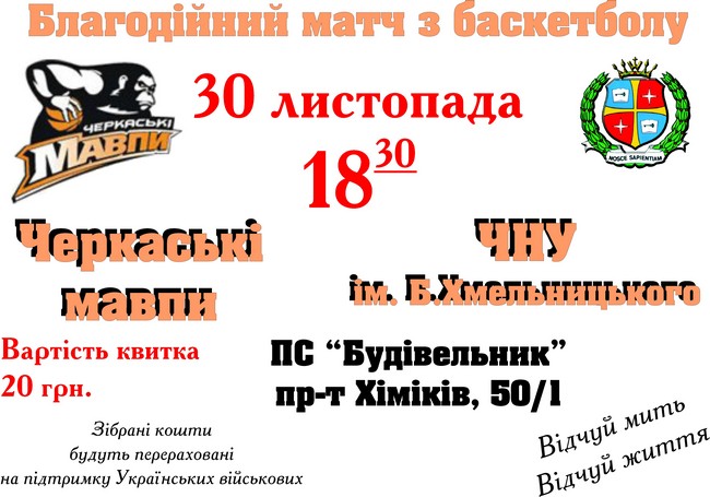 Цієї неділі 30-го листопада «Черкаські Мавпи» проведуть незвичний товариський матч. Їхніми суперниками у ПС «Будівельник» буде збірна Черкаського національного університету імені Богдана Хмельницького. Мета цього заходу – благодійна – зібрати кошти на потреби української армії. Більшість глядачів цього матчу будуть самі студенти ЧНУ. За словами організаторів у залі має бути аншлаг, адже квитки, які коштують 20 гривень, вже фактично розкупили студенти.