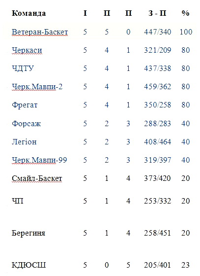 Регулярний чемпіонат Черкас з баскетболу вийшов на екватор. Нещодавно у ньому був відіграний п’ятий тур. Нагадаємо, що в аматорському турнірі беруть участь 12 команд – із Черкас (10) та Золотоноші (2). Цьогоріч боротьба у зоні плей-оф загострюється ще задовго до завершення регулярки. Особливо це стосується перших п’яти команд турніру. Поки що без поразок іде лише діючий чемпіон – «Ветеран-Баскет», який в останньому турі впевнено обіграв «Берегиню» – 94:64. Пара Панасюк-Степанов у цій грі здобула аж 58 очок. У спину ветеранам дихають відразу чотири команди, які мають у своєму пасиві лише по одній поразці. Серед когорти лідерів і молоді гравці «Черкаських Мавп-2», котрі у п’ятому турі розібралися з «Легіоном» – 101:59. У цьому матчі також особливо постарався дует лідерів, у черкасців ними виступили Вадим Голик та Євгеній Балабан.