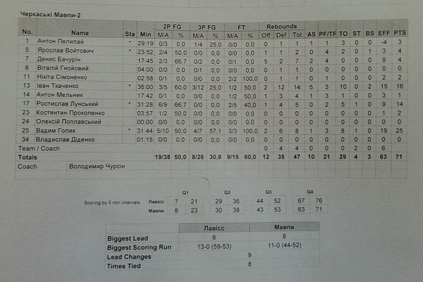 А найрезультативнішим гравцем матчу став Вадим Голік. На рахунку форварда «Мавп» 25 очок та 8 підбирань. Іван Ткаченко відзначився дабл-даблом – 16 очок, 14 підбирань та 5 передач.