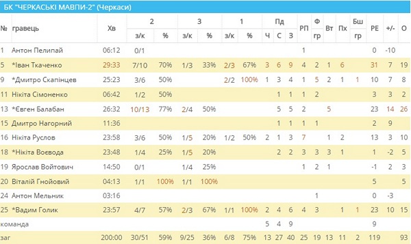 26 очок та 5 підбирань.«Черкаські Мавпи-2» - «Тернопіль-ТНЕУ» 93 : 85 (25 : 21, 22 : 15, 29 : 20,