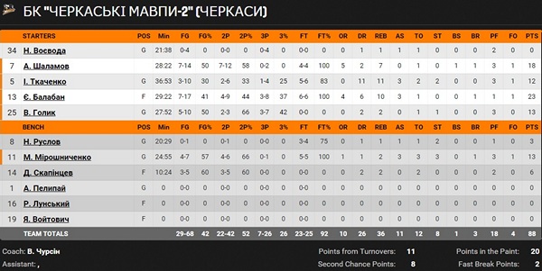 Після впевненої першої половини, яку гості виграли з рахунком 29 : 56, «Мавпи-2» програли третю чверть. Втім далі команда впевнено довела гру до логічного завершення. 72 : 95, перший матч за «Черкаськими Мавпами».