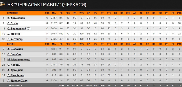 Найрезультативнішим у цьому матчі став гравець «Черкаських Мавп» Денис Носков – 22 очки і 9 підбирань, в активі хіміка Брендена Фрейзера 15 очок.Южненці повели у серії до трьох перемог – 2:0. Третій поєдинок у цьому протистоянні буде зіграно 18 квітня у Черкасах.