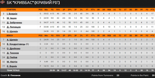 Трохи оговтавшись на тайм-ауті, підопічні Міхельсона частково реабілітувалися у другій частині періоду, ліквідувавши двозначну перевагу Кривбаса, який з шикарним відсотком кидав з-за дуги. Саме дальні влучання визначили результат стартового періоду, який баскетболісти Плеханова впевнено виграли.