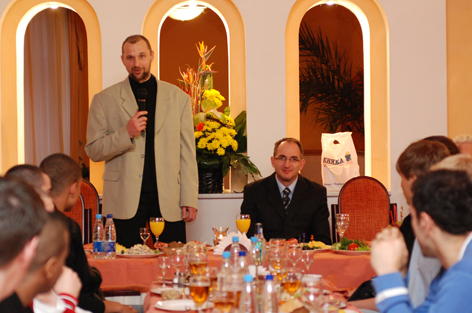 На свято завітали усі партнери та меценати Клубу. Люди відомі в бізнесових колах, як меценати та партнері баскетболу на Черкащині. До них звернувся головний тренер Йовіца Арсіч. Як завжди серйозно і легко, він звернувся з привітанням. Подякував людям, завдяки яким баскетбол взагалі існує. Подякував, за запрошення до Черкас. Подякував, тим, хто причетний до організації гідної вечірки.