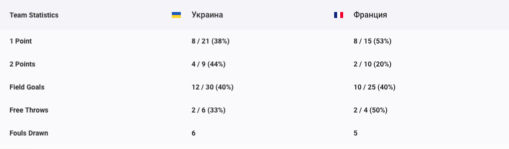 Французи зробили ривок на старті матчу (3:0), але за рахунок двох влучних дальніх поспіль Україна вийшла вперед і лідерство не відпускала вже до кінця матчу, довевши його до перемоги.